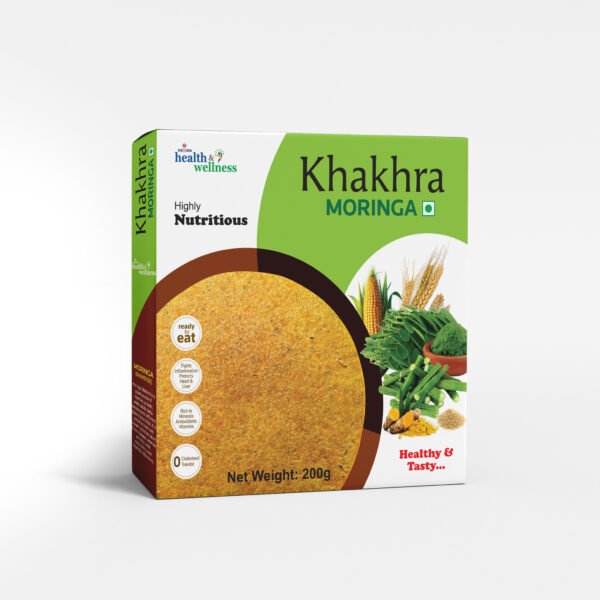 Nexina Health and Wellness Moringa Khakhra is a highly nutritious, cholesterol-free Indian snack made with Fresh Moringa Leaves — one of the world's most nutrient-dense plant foods — baked into a delicious multi-grain Khakhra base of Wheat, Jowar, Corn, and Rice Flour. Rich in vitamins, protein, amino acids, antioxidants, and beta-carotene. 200g | Vacuum Packed | Healthy & Tasty.