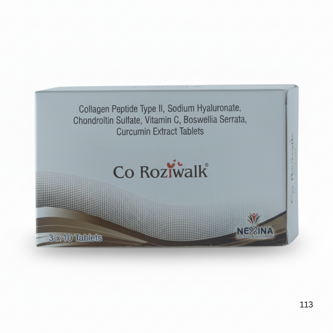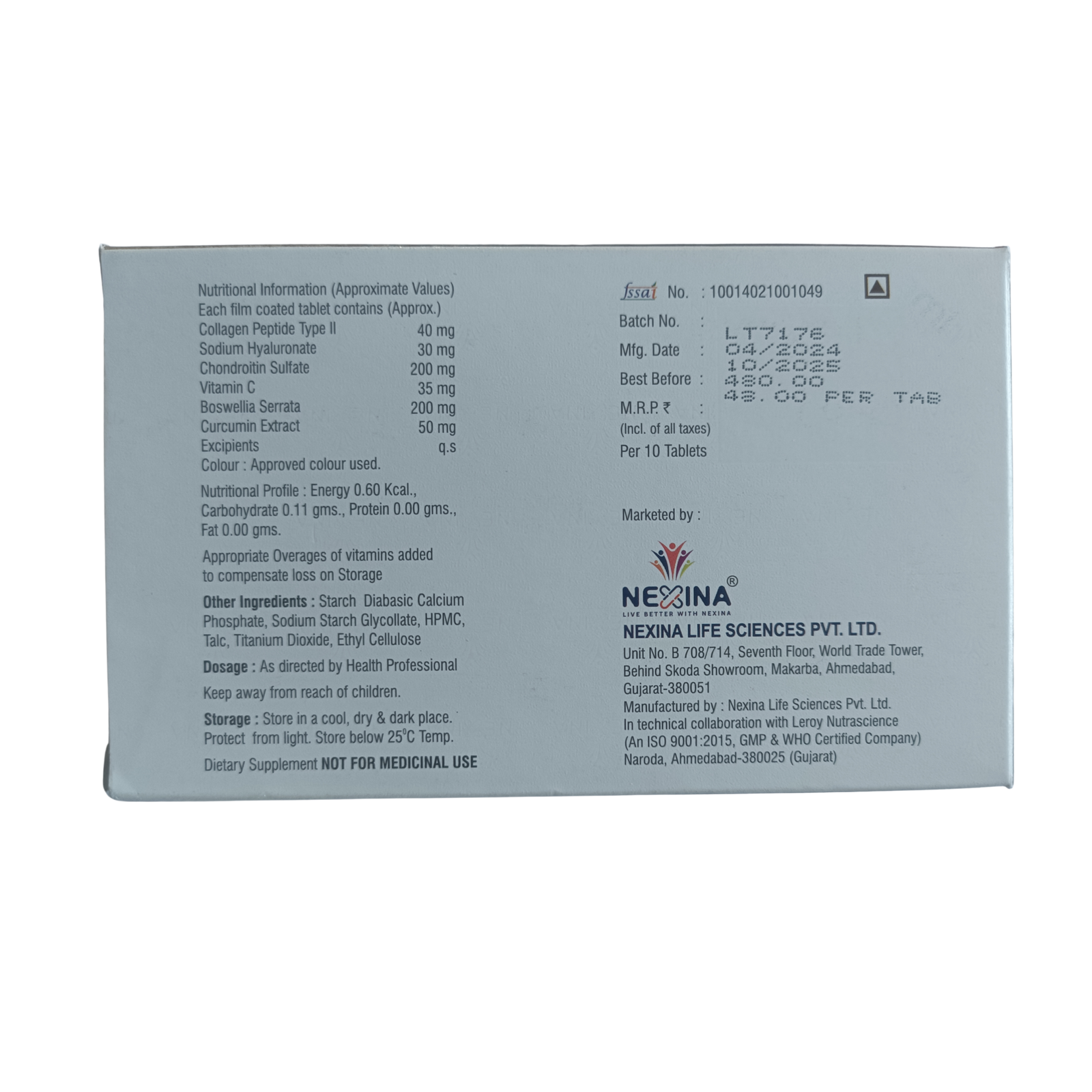 Collagen peptide Type Ii 40 mg + sodium hydronate 30 mg + chondrotin sulphate 200 mg vit C 35 mg + Bosewellia Serrata200 mg + curcumin Extract 50 mg
