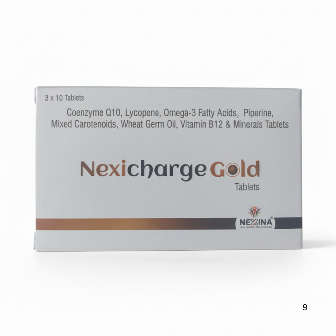 Coenzyme Q10 100mg, Lycopene 10000 mcg, Omega 3 Fatty acid (contains EPA + DHA) Natural mixed Carotenoids 10% 10.33 mg, Wheat germ oil 25mg, calcium Ascorbate 75mg, Vitamin B12 1500mcg, Selenium 75mcg, Zinc sulphate monohydrate 27.45mg